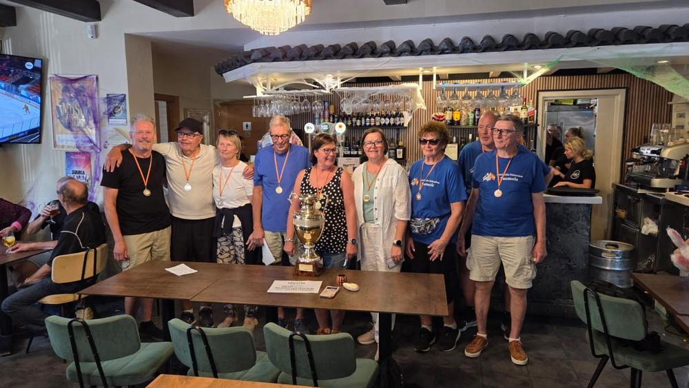 Vuoden 2025 SM-mölkyn yleisen sarjan voittajakolmikko kuvassa yli viiden tunnin pelien jälkeen, eli Martti, Markku J ja Petteri. Seuraavat sijat menivät Jorelle, Juhalle ja Allulle.