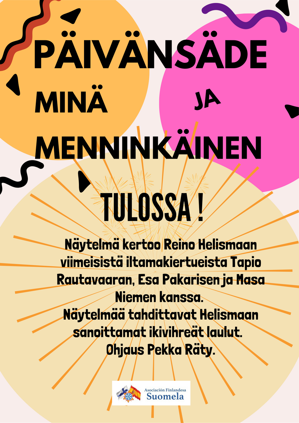 Rakenteilla on korkeatasoinen, ammattijohtoinen teatteriryhmä, joka toimii Suomelan taideharrastusten rinnalla. Haluamme rakentaa Aurinkorannikon taideharrastuskenttää vetovoimaiseksi aina koulutustoimintaan saakka yhteistyössä Suomessa toimivien järjestöjen kanssa.