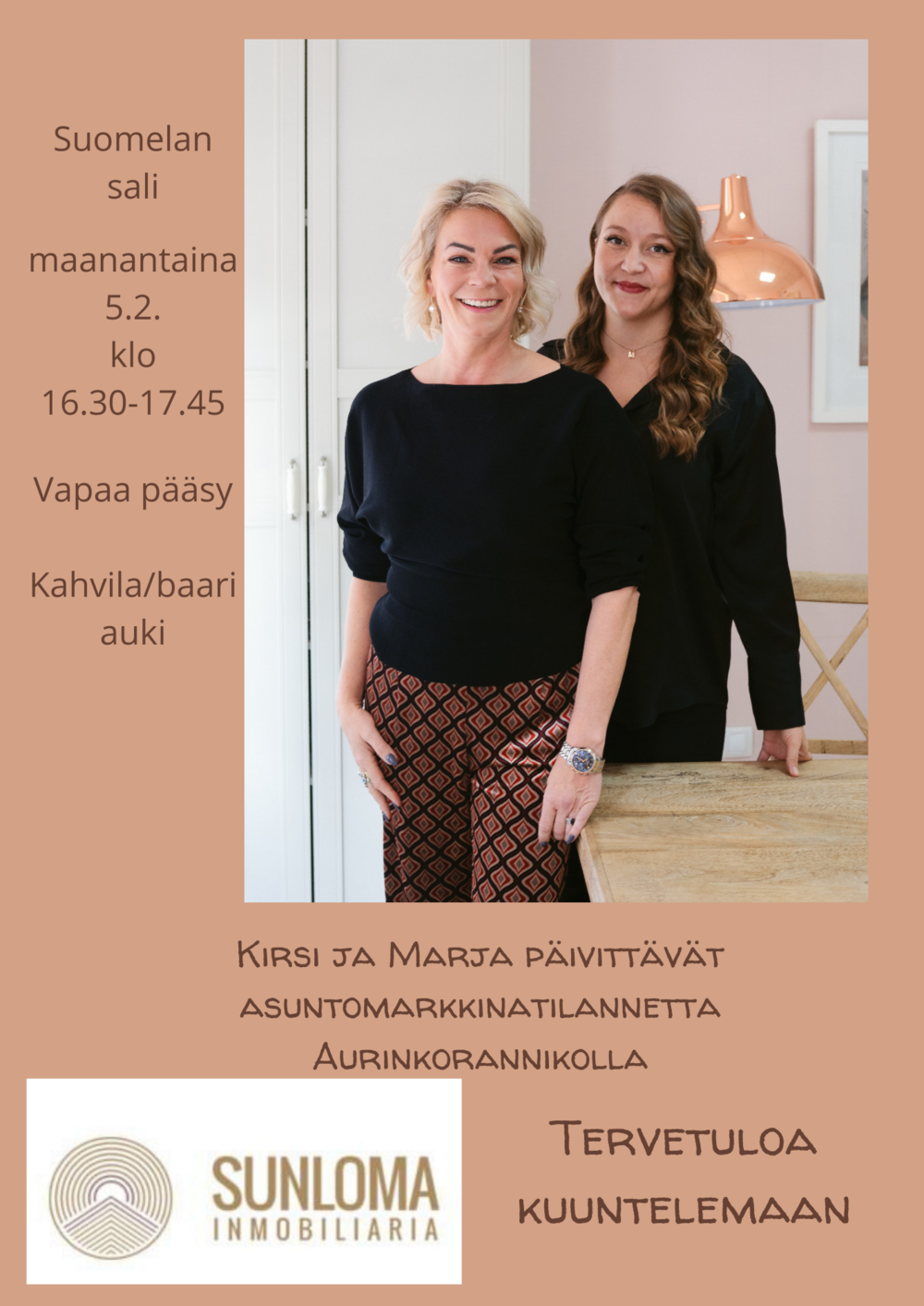 Tervetuloa kuuntelemaan tuttujen asunnonvälittäjien, Kirsin ja Marjan, informatiivista luentoa asuntokauppatilanteesta sekä vuokraustilanteesta Aurinkorannikolla. He vastaavat mielellään kysymyksiin!